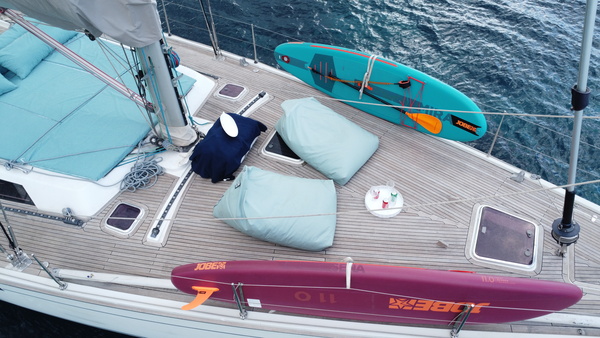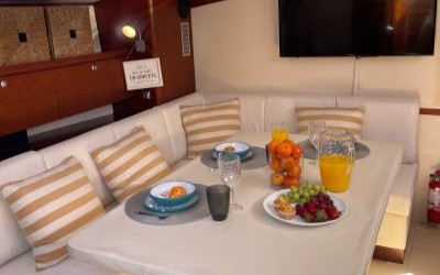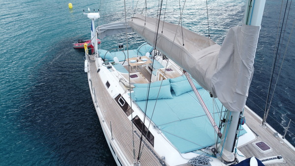 Sus 16,08 metros de eslora y 4,91 metros de manga ofrecen todo el confort que esperas. Capacidad para 12 personas, ámplios espacios interiores y exteriores, un salón luminoso con un sofá convertible en cama doble, 3 camarotes dobles con baño privado completo (WC y ducha), cocina equipada, 3 neveras, congelador y máquina de hielo. En la cubierta podrás disfrutar de solárium tanto en Proa como en popa, así como de la zona de pufs ubicada en proa.